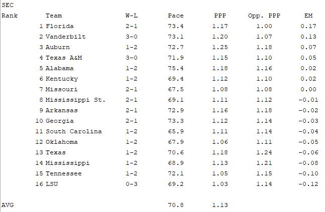 The only team close to what would be considered an acceptable defensive efficiency rate back in the early aughts would be the defending champion Florida Gators. At the moment, they are allowing right at one point per possession, ahead of the rest of the conference by a pretty significant margin. Perhaps the Gators are getting finally getting into gear.