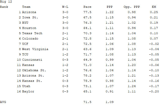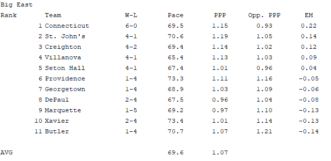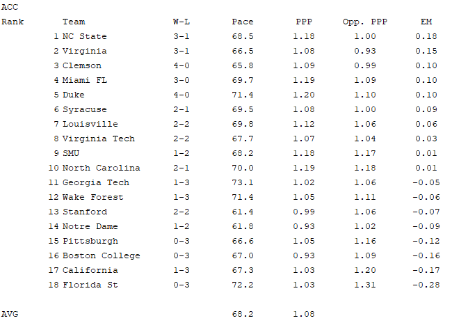 The NC State Wolfpack are the current frontrunners of the ACC in terms of efficiency margin, outscoring the competition by 0.18 PPP. This accomplishment was reached with victories over Wake Forest, Boston College, and Florida State, who are currently combined 1-9 in ACC play. This is perhaps not an achievement to howl about just yet, but winning is winning, as they say. Salute to the Wolfpack faithful, who have spent more time in the Boston College neighborhood than the Duke/UVA neighborhood in recent years.