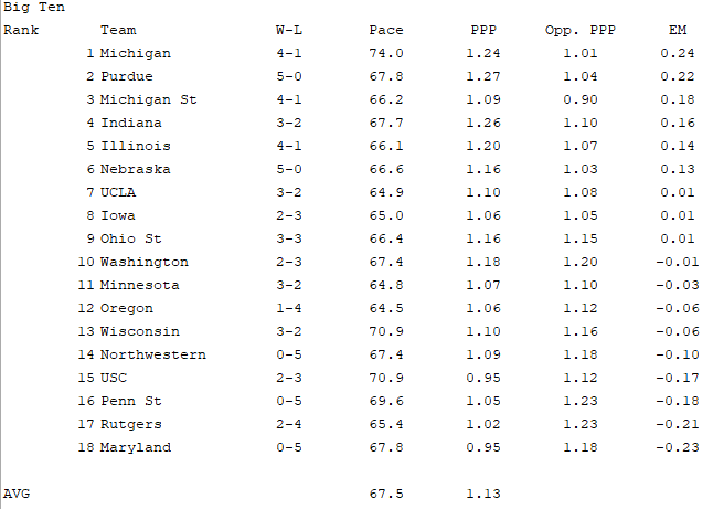 Through roughly five games apiece, the Big Ten is averaging 1.13 points per possession. That is higher than last season’s SEC, which finished around 1.09 PPP on the year and, as far as I can tell, the highest average points per possession of any conference this millennium.