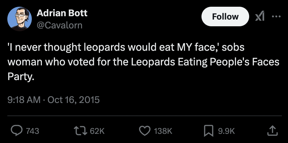 Konservative med et midlertidigt standpunkt. 😂😂😂 Ak ja. Et standpunkt er jo et standpunkt, indtil man tager et nyt. Det sjove er jo absolut, at de overhovedet ikke selv kan se det. Om jeg fatter, at folk med en fungerende hjerne beslutter, at nutidens konservative bevægelse er noget for dem. Det er jo at frivilligt lade sig hjernevaske til at tro på alt, hvad der er modsat virkeligheden.