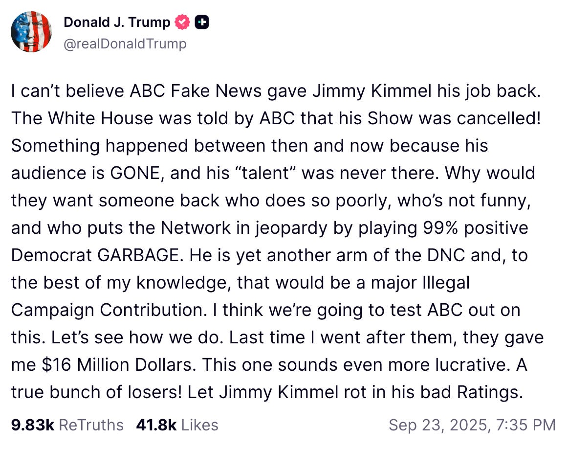 Trump rages in a Truth Social post after Kimmel returned to his show back in September,
