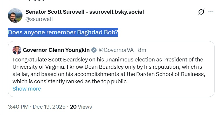 - VA Senate Majority Leader Scott Surovell asks, “Does anyone remember Baghdad Bob?”