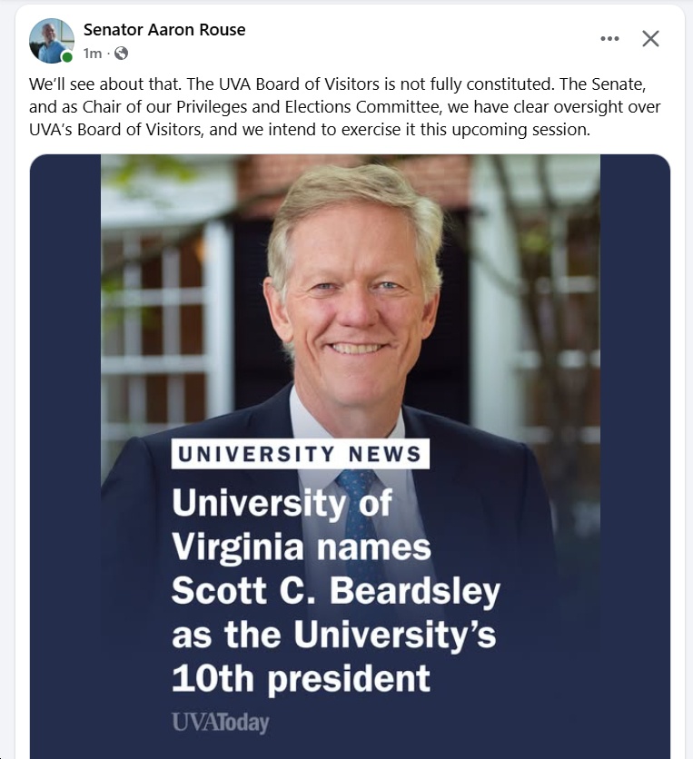 “We’ll see about that. The UVA Board of Visitors is not fully constituted. The Senate, and as Chair of our Privileges and Elections Committee, we have clear oversight over UVA’s Board of Visitors, and we intend to exercise it this upcoming session.” – VA State Sen. Aaron Rouse