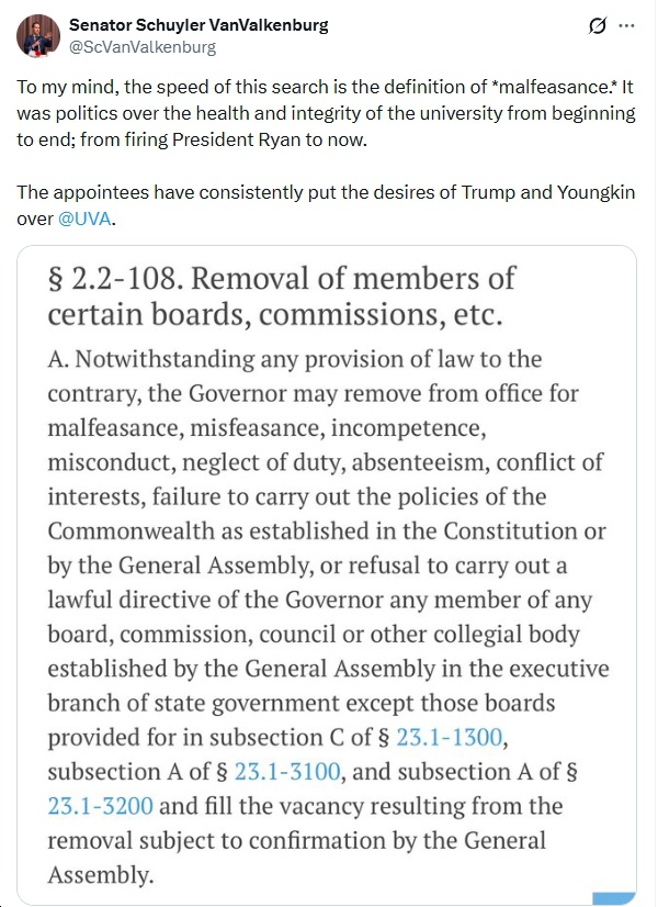“Governor Youngkin’s decision to advance the appointment of a new president at the University of Virginia in the waning days of his administration, just as Governor-elect Abigail Spanberger prepares to assume office, raises serious concerns about process, institutional norms, and respect for a democratic transition.