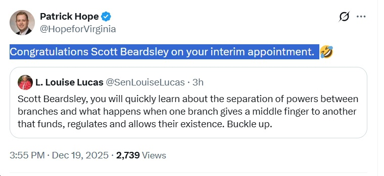 “Scott Beardsley, you will quickly learn about the separation of powers between branches and what happens when one branch gives a middle finger to another that funds, regulates and allows their existence. Buckle up.” – Sen. Louise Lucas